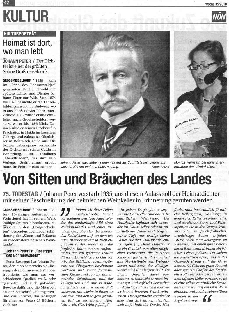 Der 75. Todestag von Johann Peter am 14.2.2010 blieb in Großmeiseldorf nach der früheren "Euphorie" über den Heimatdichter gänzlich unbemerkt - der NÖN war er im September 2010 einen Artikel wert: