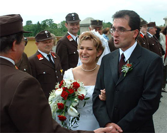 Brautpaar die Glückwünsche zu überbringen. Die Feuerwehrkameraden der